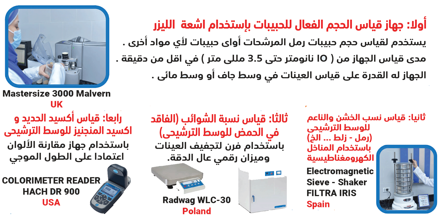 يقوم المعمل بإجراء الاختبارات على جميع أنواع الأوساط الترشيحية (الرمل -الزلط - الانثراسيت ... الخ)ـ